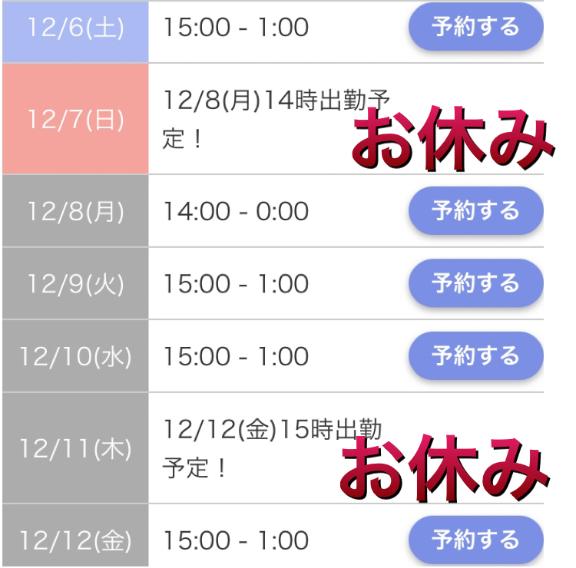 | 12月2日(火) | 12/3(水)11時出勤予定 |