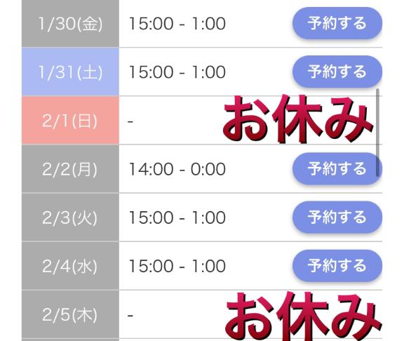 | 2月8日(日) | 2/9(月)14時出勤予定! |